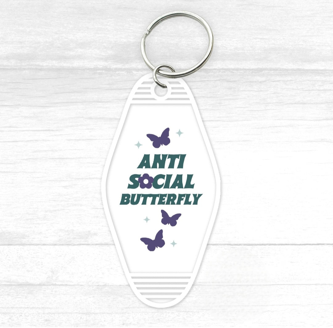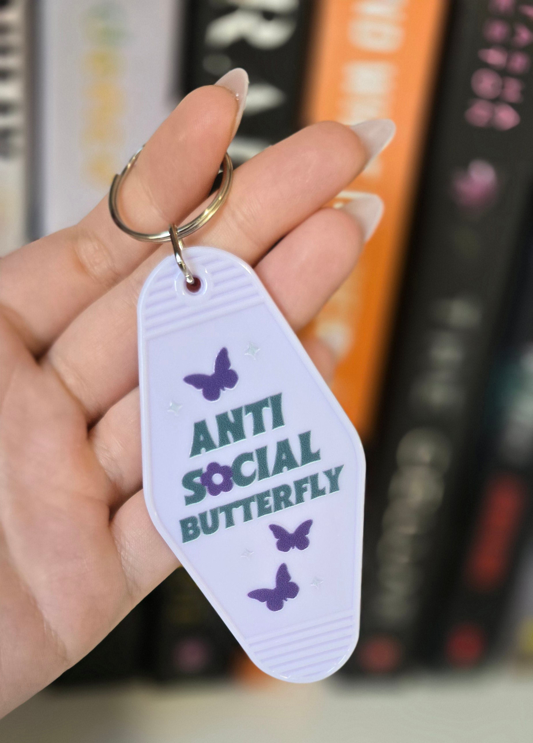 For those who prefer solitude over socializing. This vintage-inspired motel keychain features the playful phrase “Anti-Social Butterfly”—a reminder that it’s okay to embrace your introverted side.