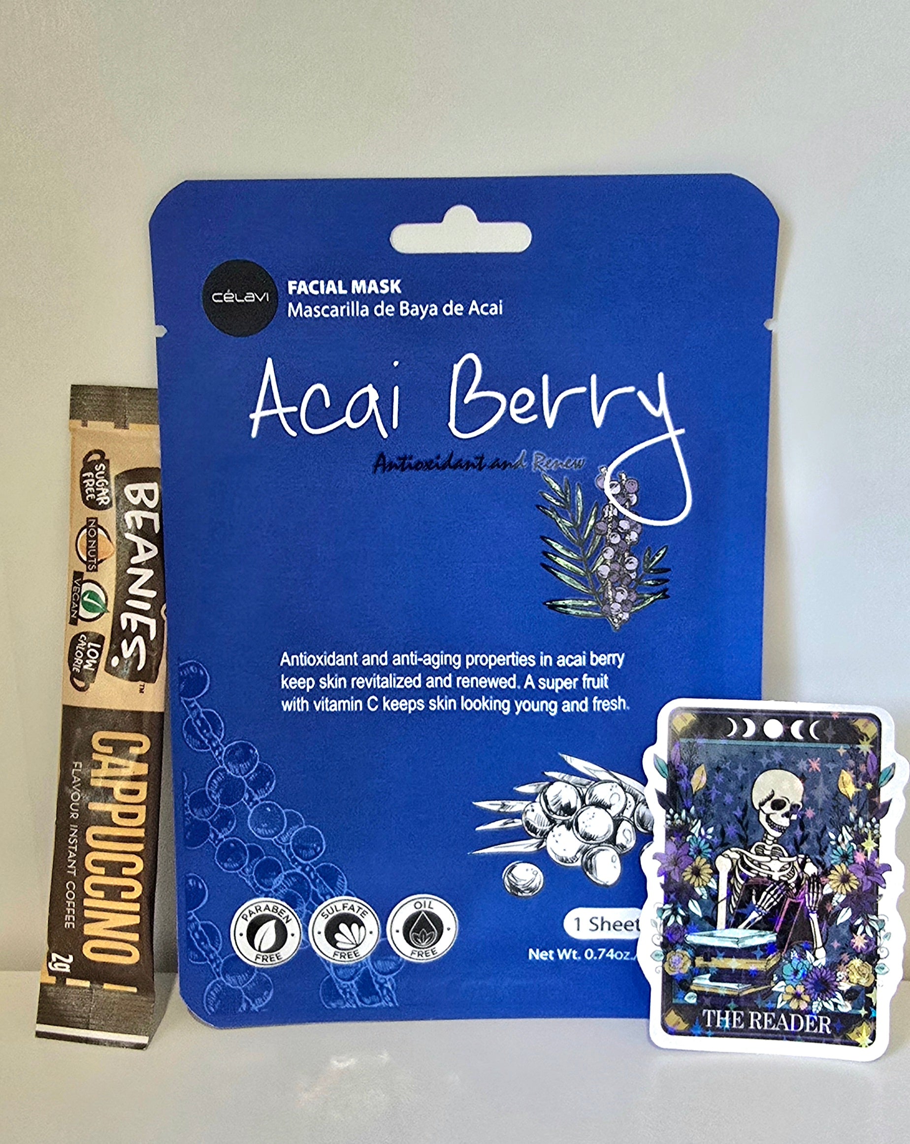Every book comes with a little self-care bundle: a face mask, coffee or tea, a pen, and a bookmark with stickers. Please note, all scents, flavors, and colors may vary—making each surprise completely unique!