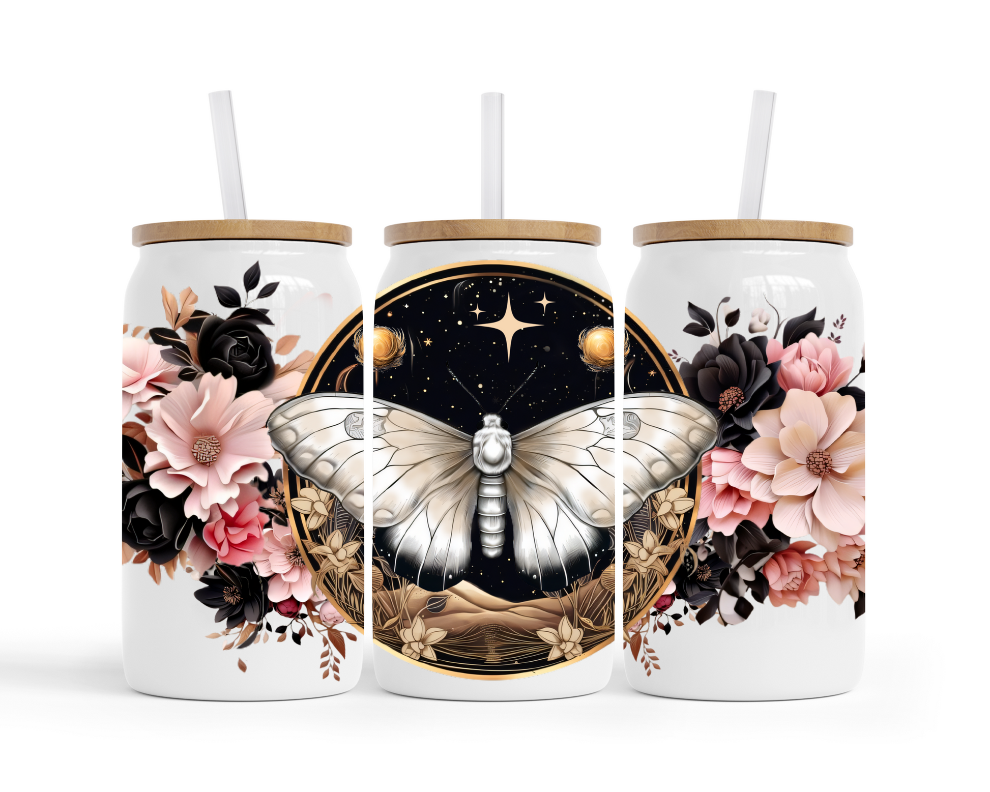 Introducing the *Celestial Floral Moth* White Glass Tumbler – a 16oz masterpiece that blends the magic of the night sky with the delicate beauty of nature. Featuring a celestial moth surrounded by intricate flowers, this tumbler captures the mystique of the cosmos and the elegance of blooming flora. Perfect for your favorite iced beverages, it adds a touch of ethereal charm to any moment. Ideal for nature lovers, stargazers, and those who appreciate the beauty of the universe, the *Celestial Floral Moth* tumbler is a unique and inspiring way to stay refreshed.