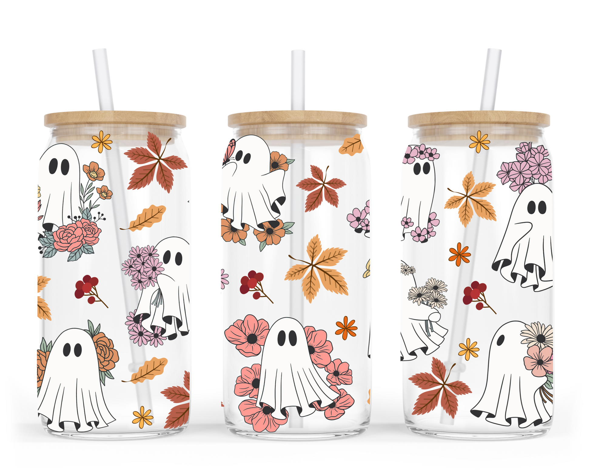 Boo & Brew Glass Cup – 16oz Frosted Fall Ghost Tumbler with Bamboo Lid & Straw | Cozy Spooky Season Gift