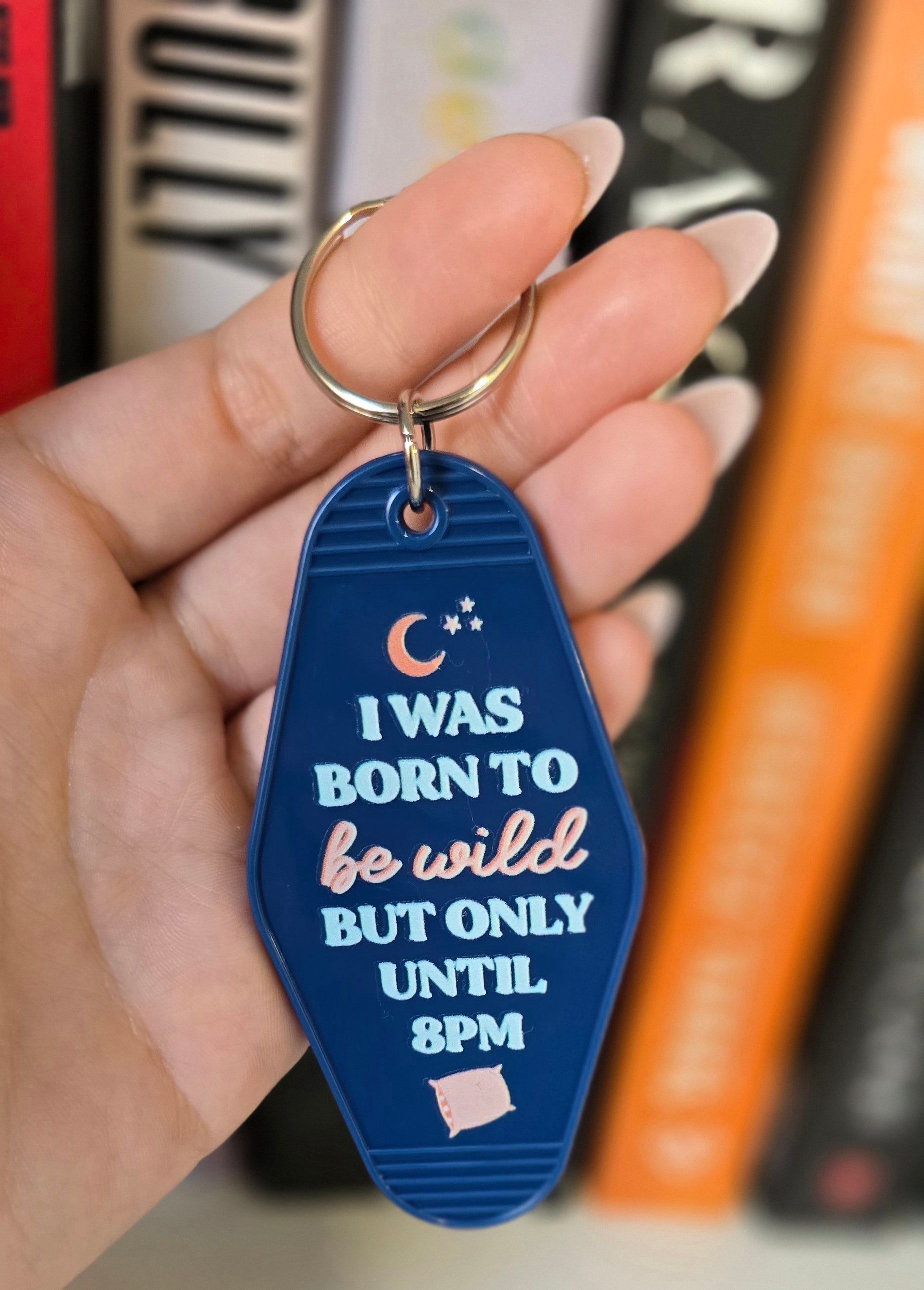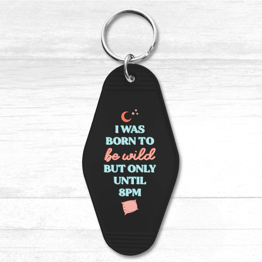 For those who live for the wild, carefree moments—until it’s time to crash early. This vintage-inspired motel keychain features the playful phrase “I Was Born To Be Wild Until 8 PM”—because sometimes, bedtime is calling.