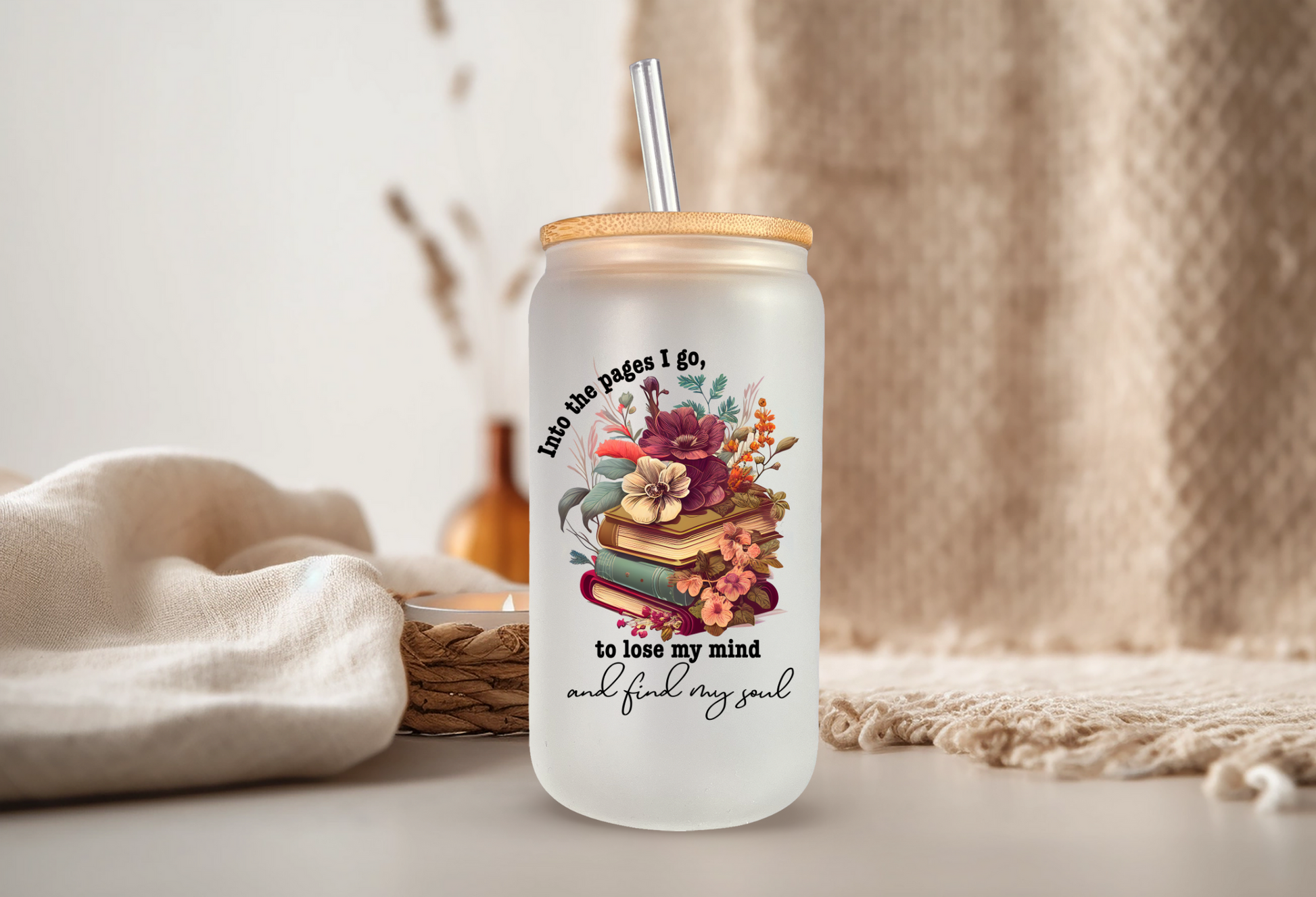 Into the Pages Glass Tumbler – 16oz Reusable Cup for Coffee, Tea, and Book Lovers with Bamboo Lid & Straw