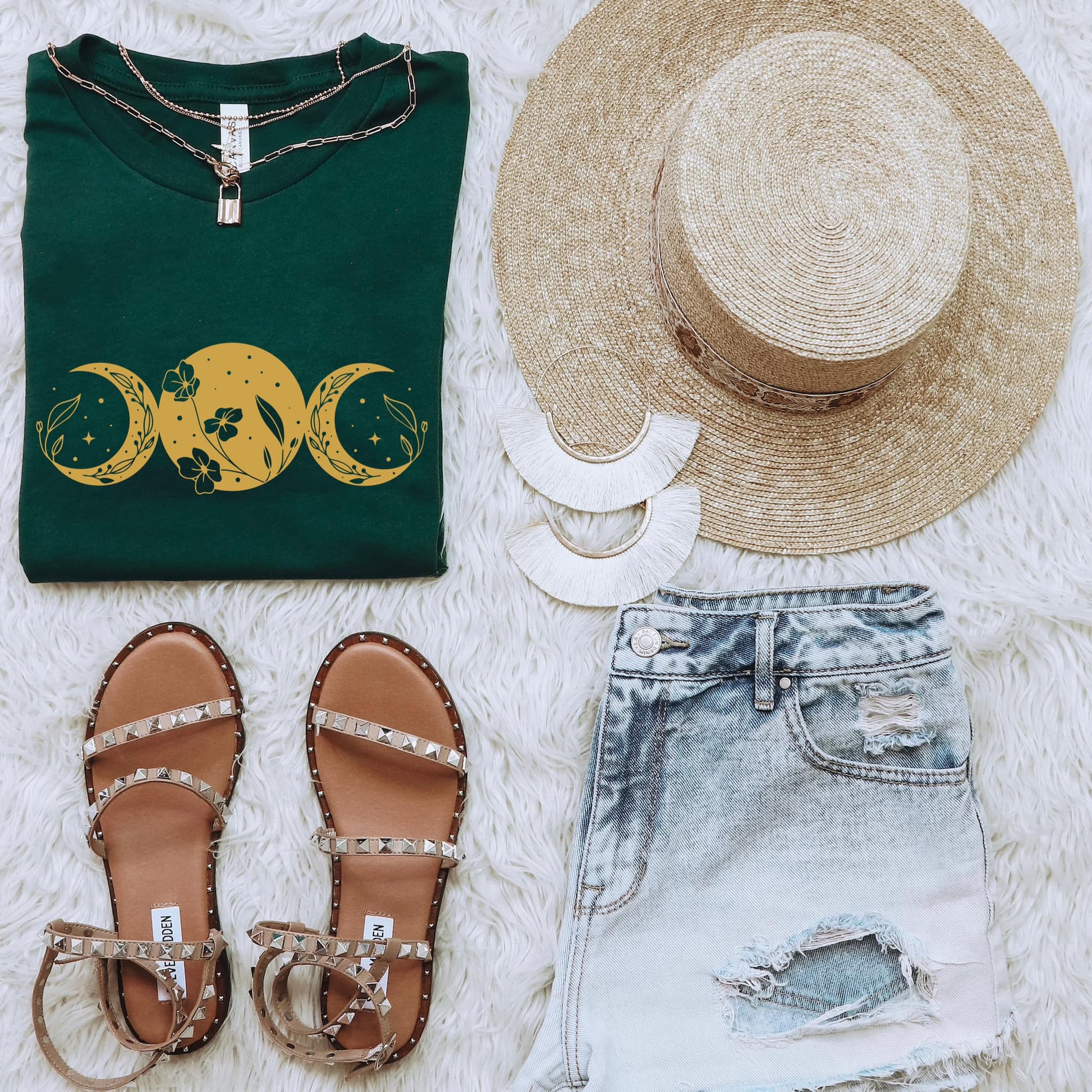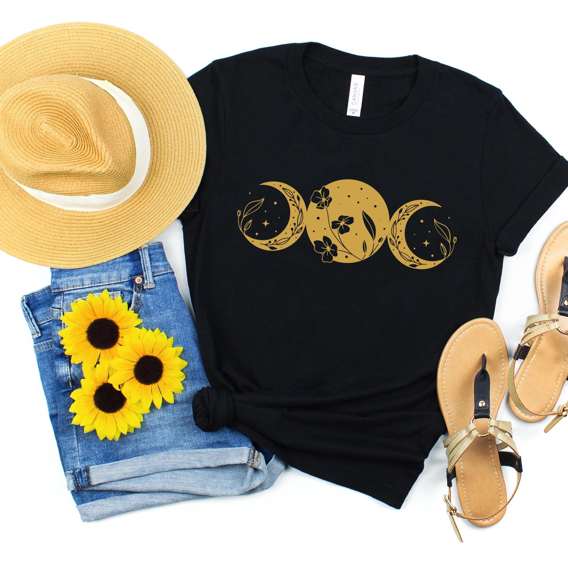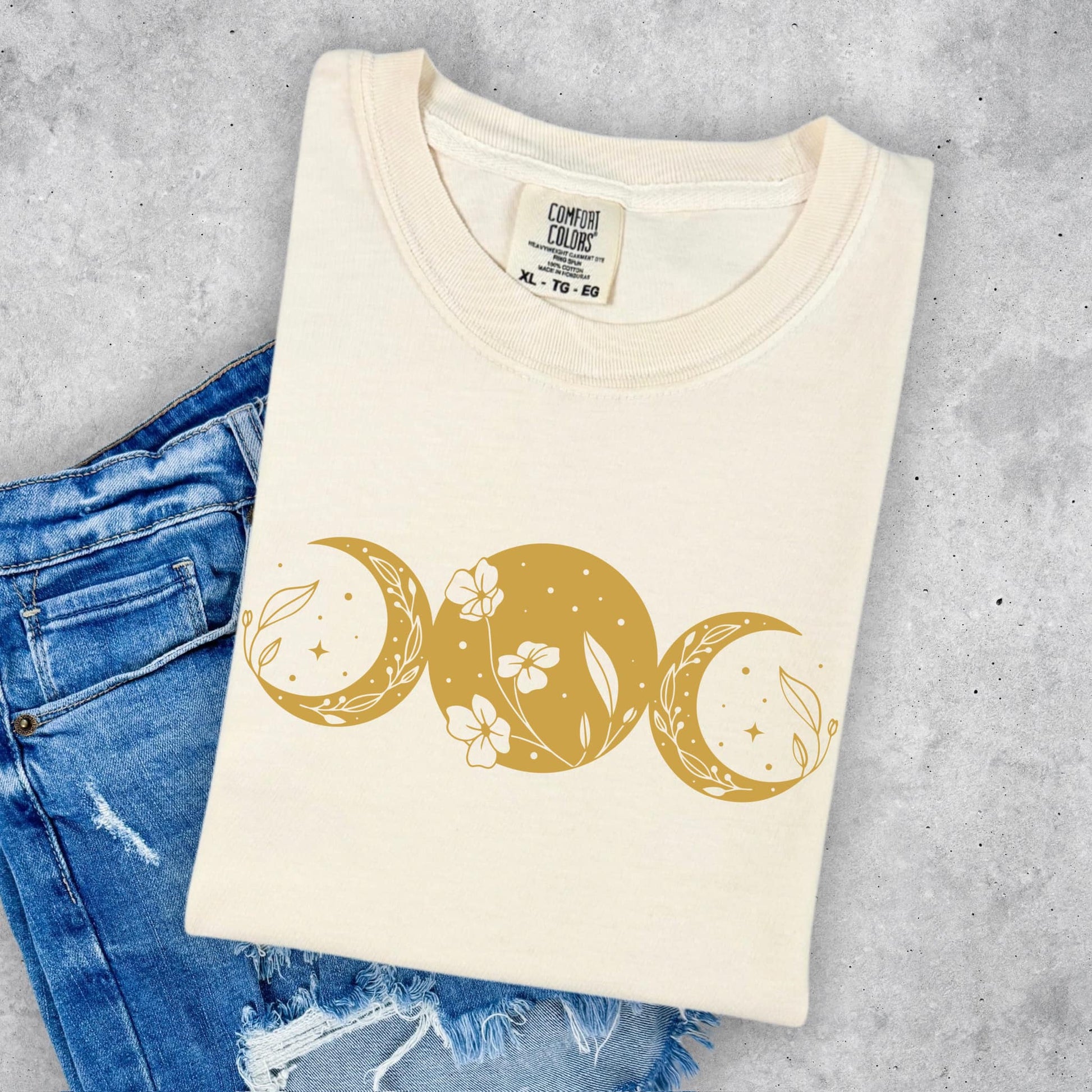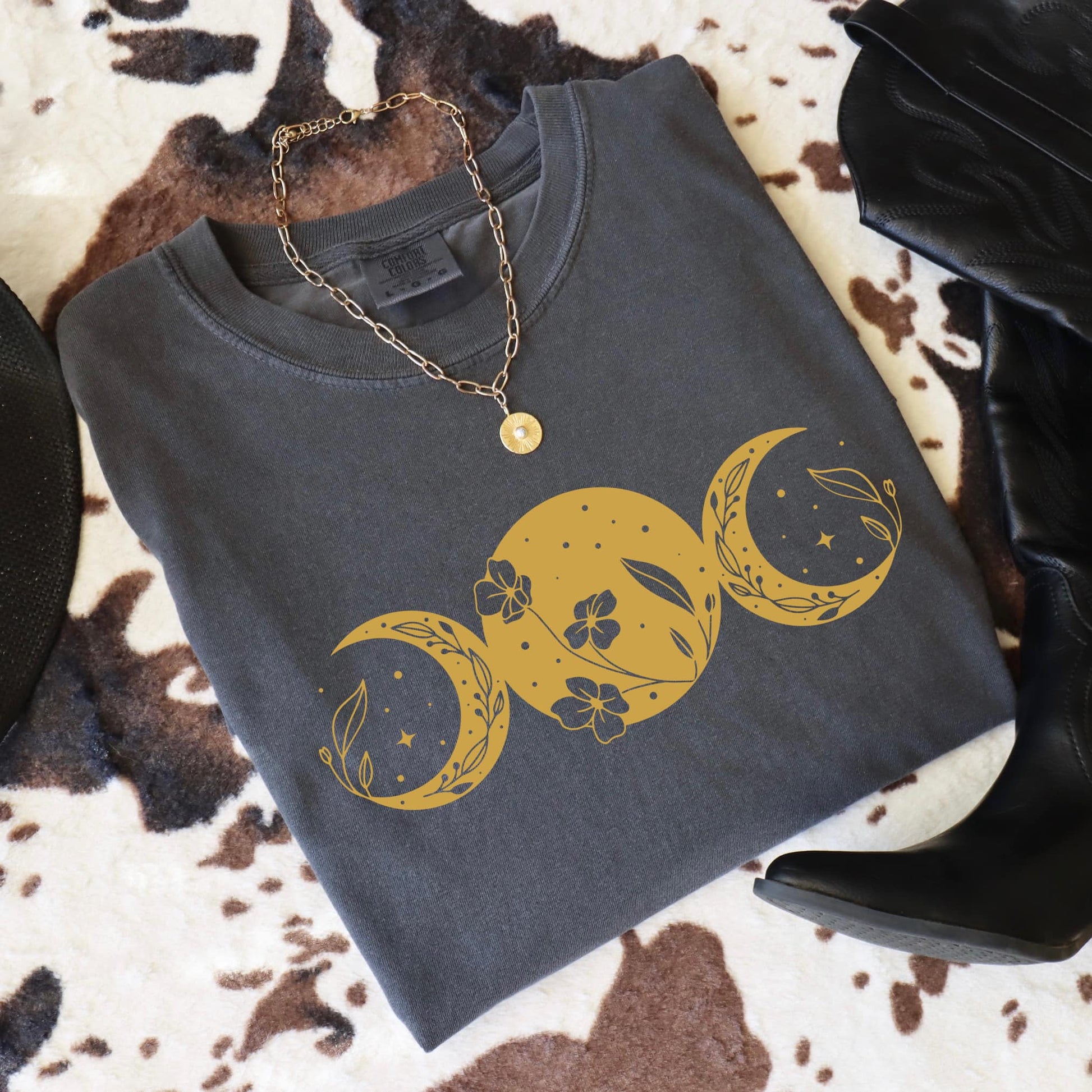 This shirt was made for the dreamers, the quiet rebels, and the ones who always find light in the dark. Featuring a delicate row of metallic gold moons—each one a reminder that it’s okay to grow, change, and begin again.