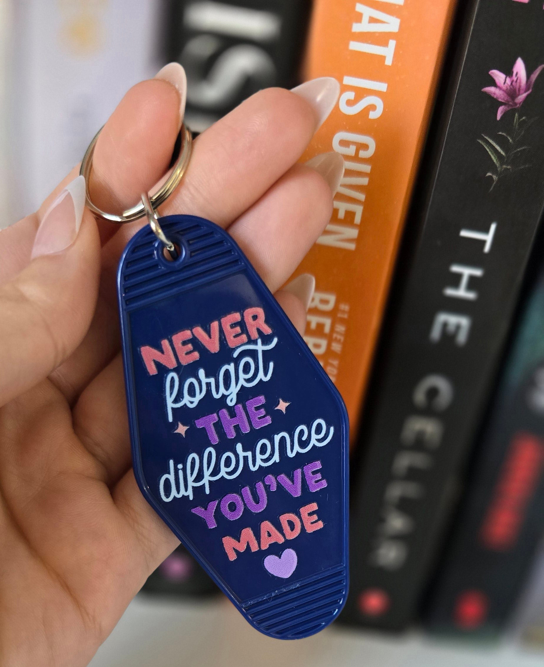 For those who leave a mark, big or small. This vintage-inspired motel keychain features the inspiring phrase “Never Forget The Difference You Made”—a reminder to celebrate the impact you’ve had on the world.