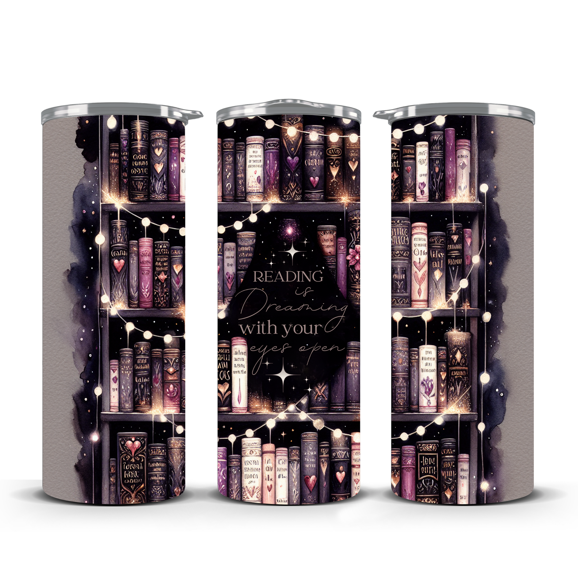 Introducing *The Dreamer’s Library* Stainless Steel Tumbler – a 20oz tumbler that transports you to a world of imagination with every sip. Featuring a dreamy design inspired by the magic of books and endless possibilities, this tumbler is perfect for those who love to lose themselves in a good story. Crafted with durable stainless steel and double-wall insulation, it keeps your beverages hot or cold for hours, making it the ideal companion for your reading adventures. Whether you're enjoying a cup of tea in your favorite nook or taking your drink on the go, *The Dreamer’s Library* tumbler adds a touch of literary charm to every moment. Drink deeply, dream wildly.