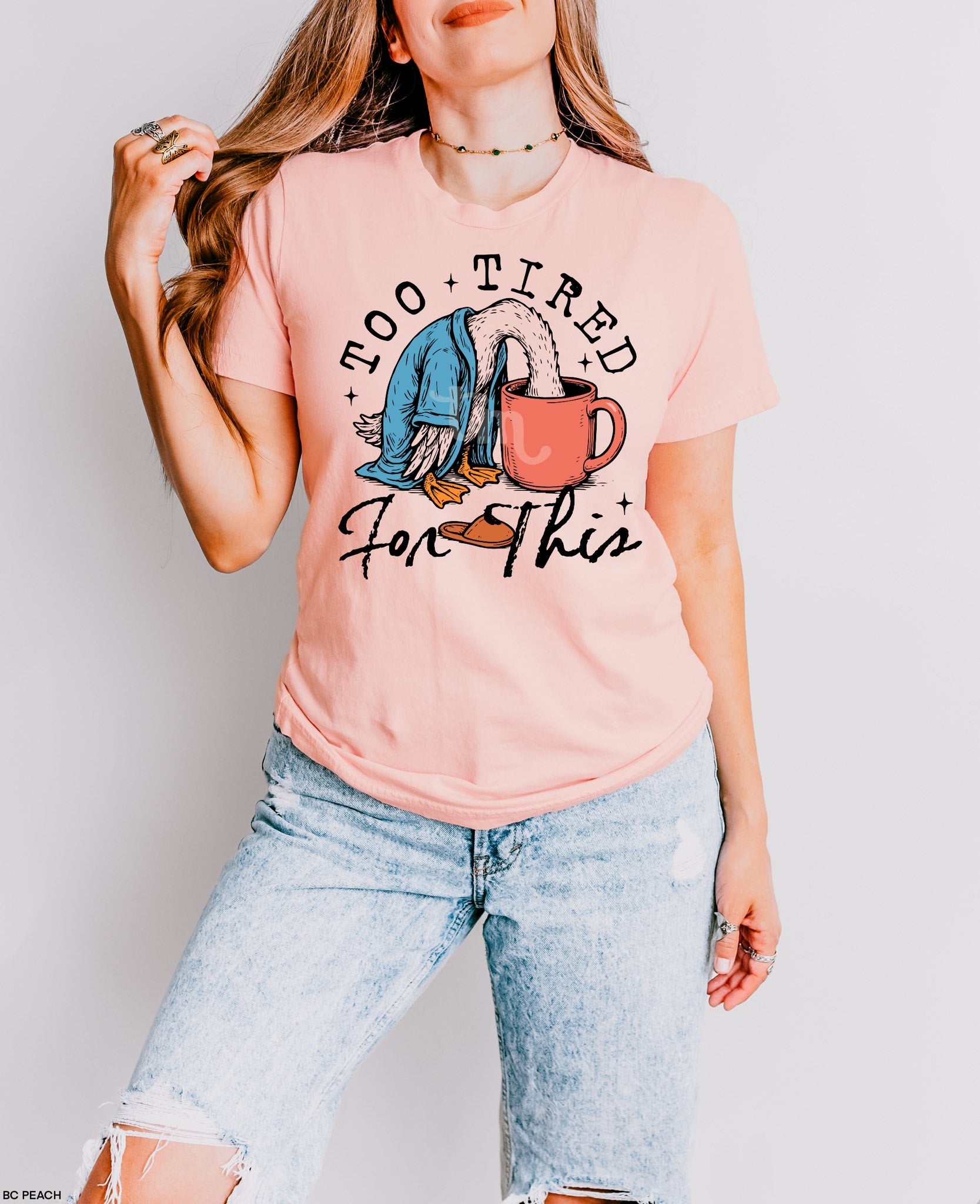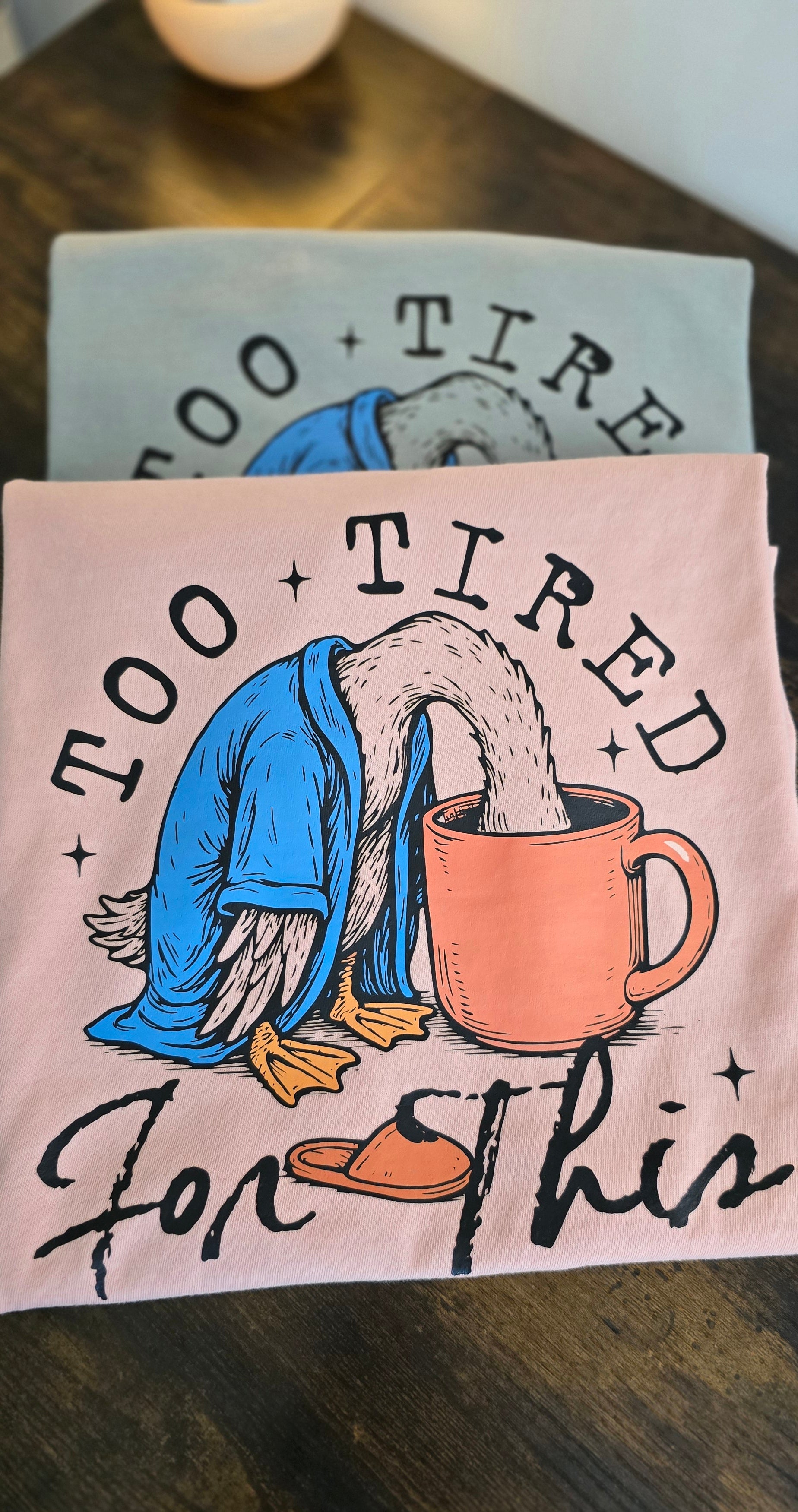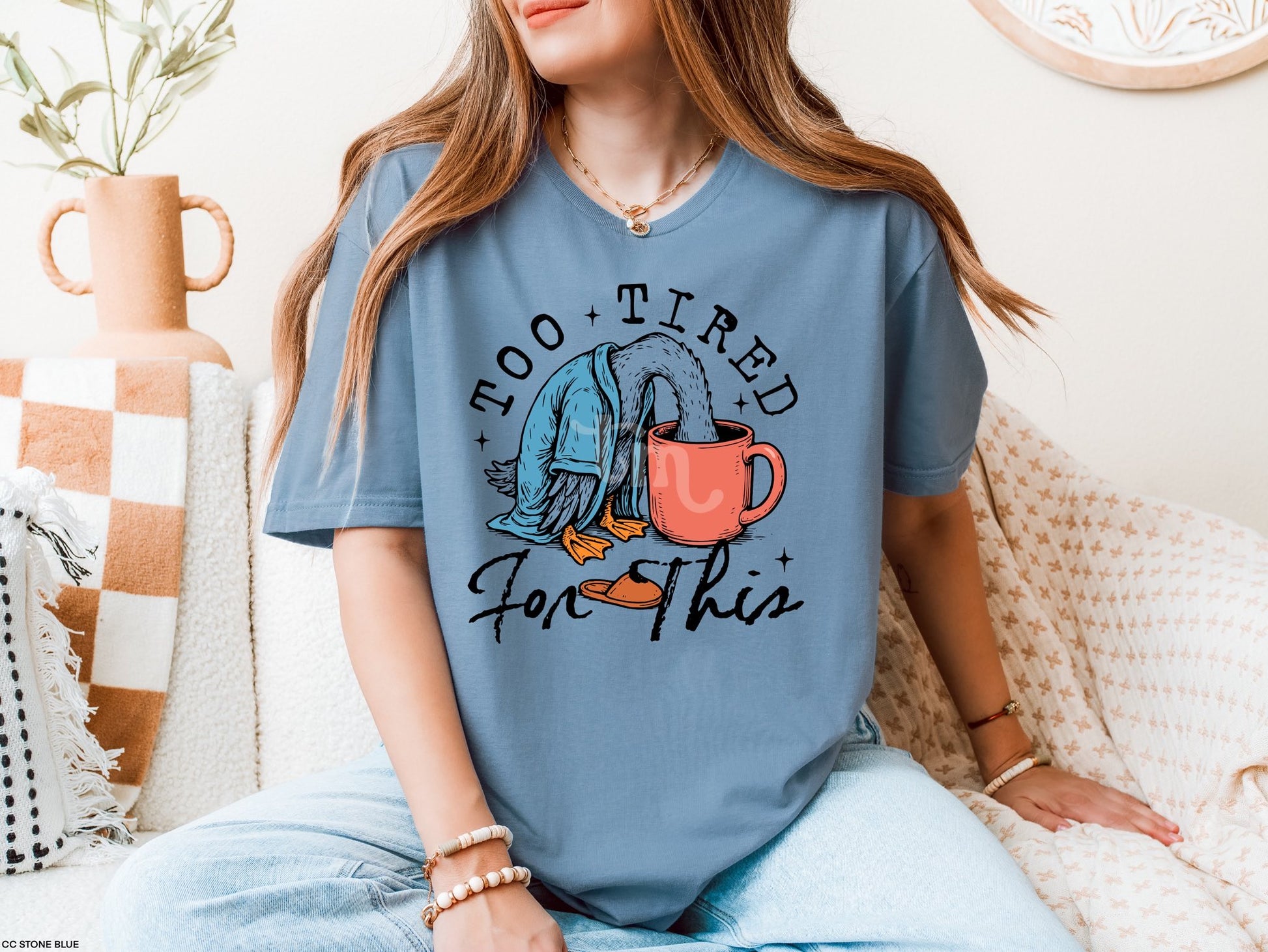 Some mornings just hit different—and this duck gets it. The “Too Tired for This” tee features an adorably exhausted duck face-planted into a coffee mug, wrapped in a cozy hoodie, and radiating pure "I can't" energy.